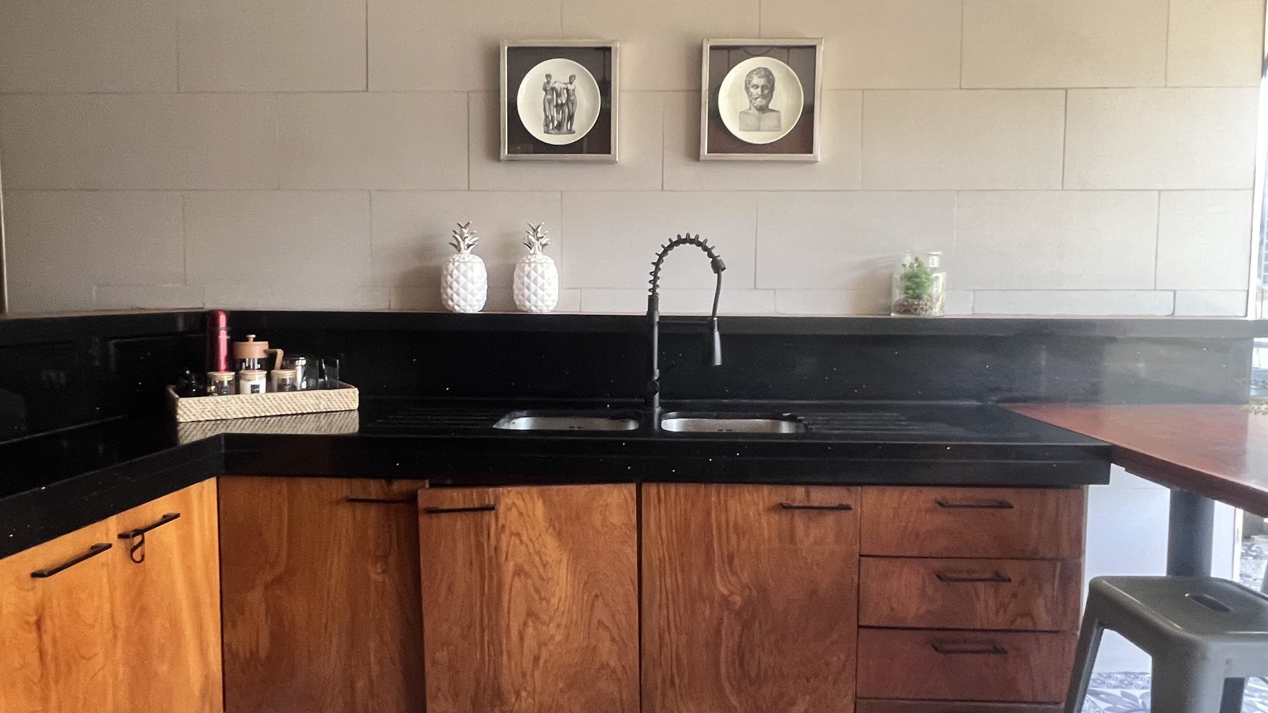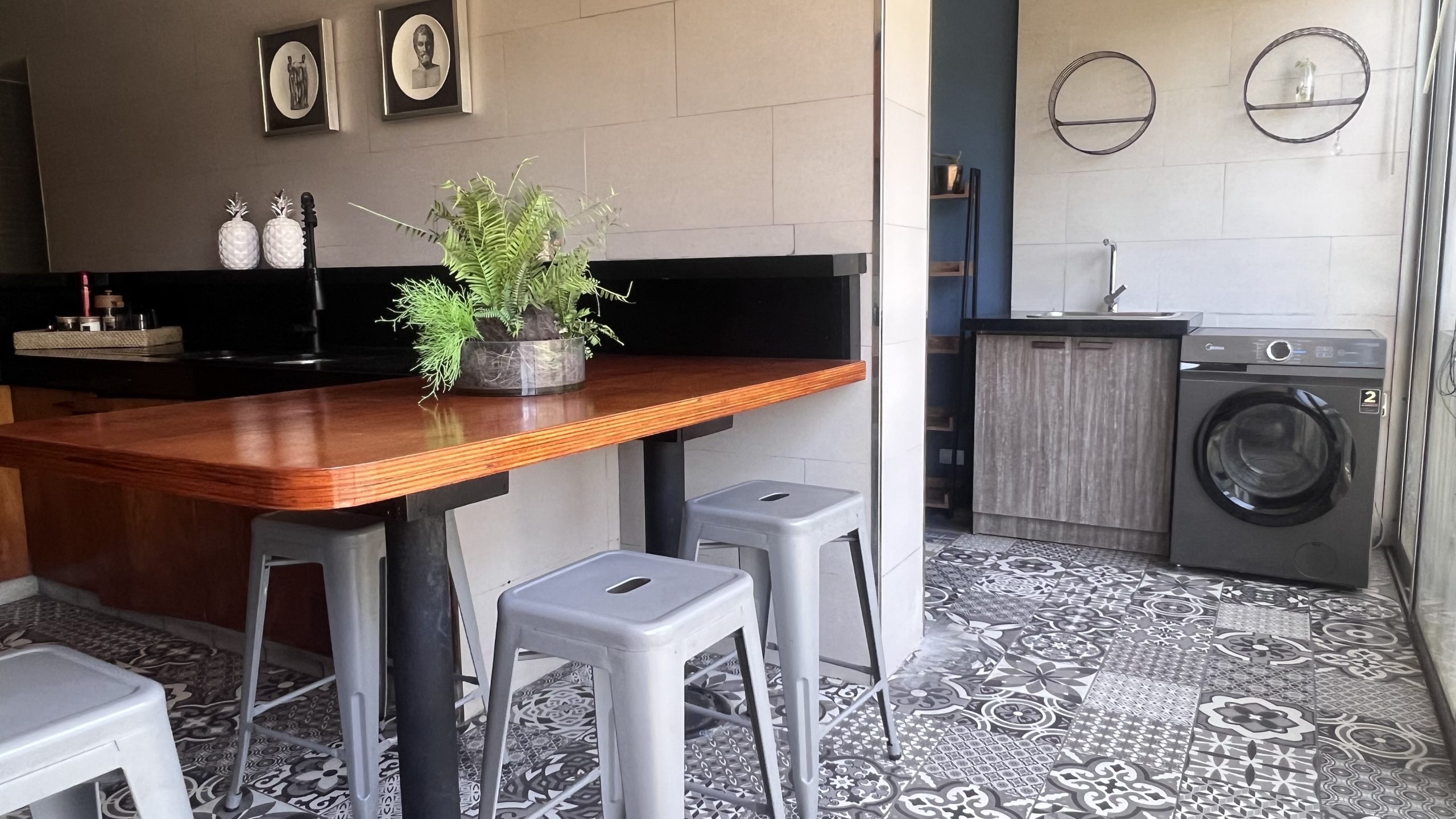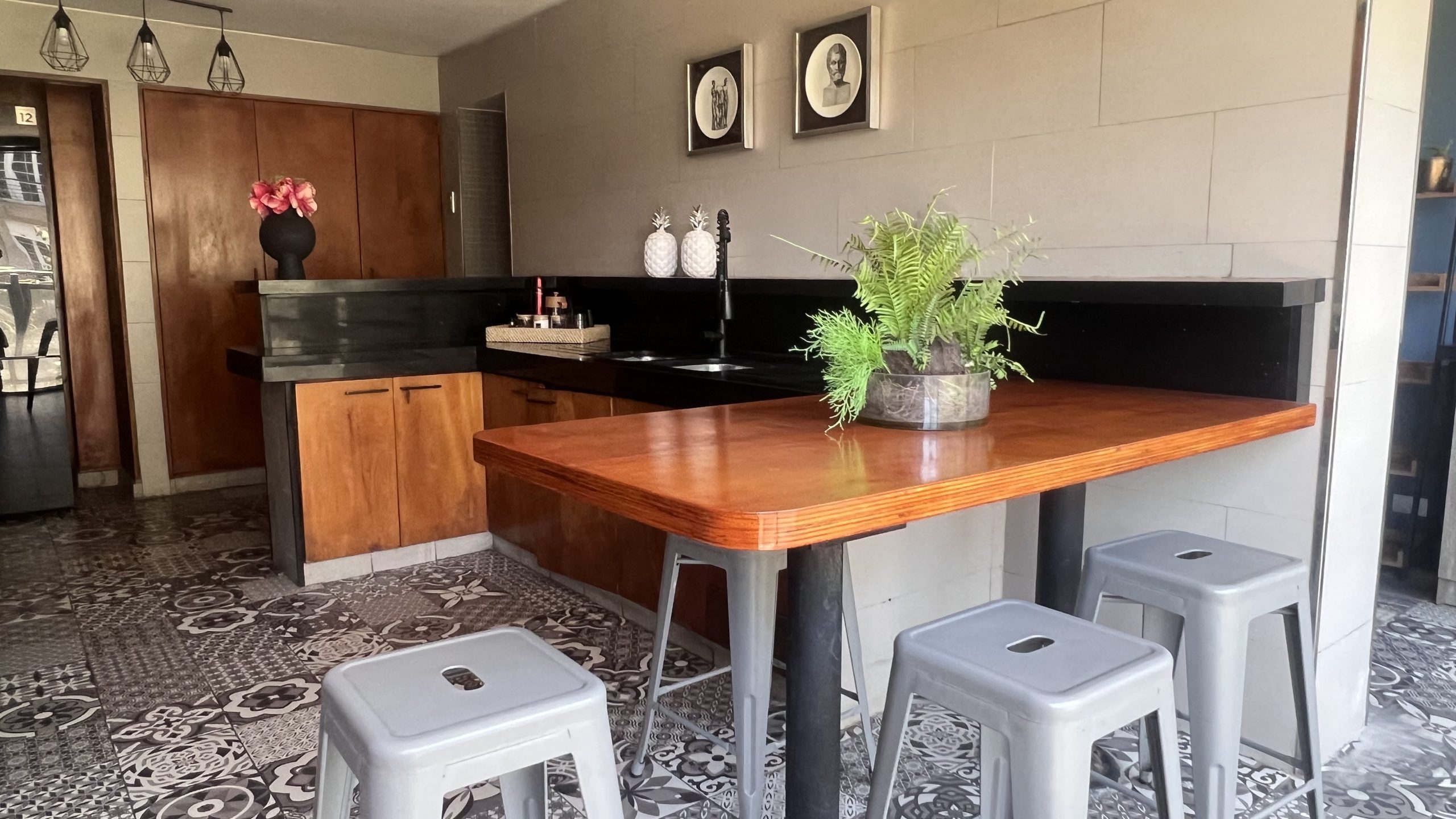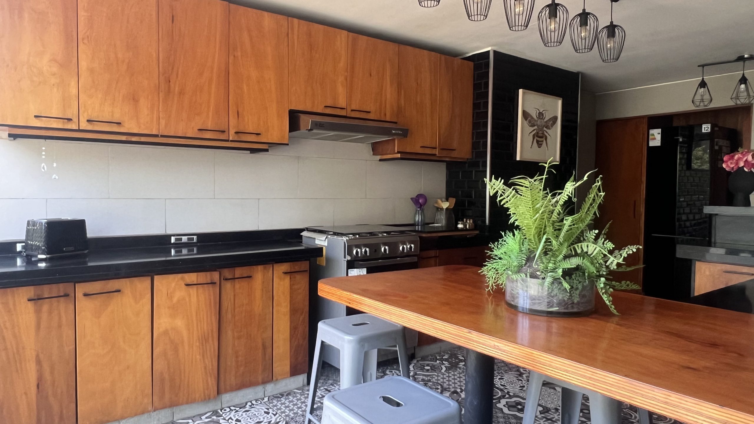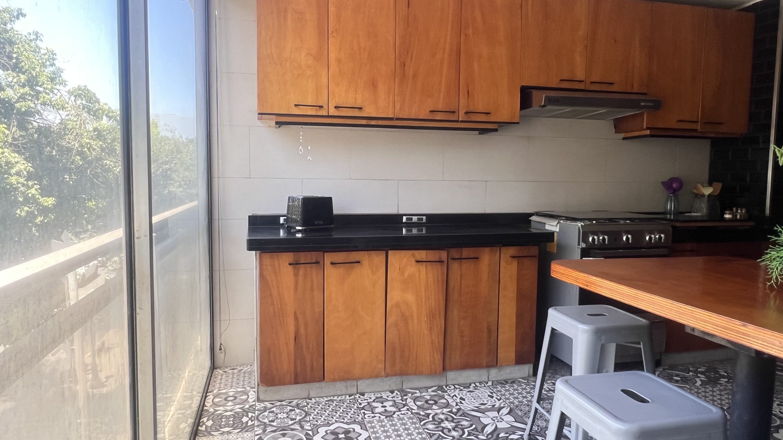 * Cocina con mesón de diario para 4 personas, más barra con capacidad de dos personas mas